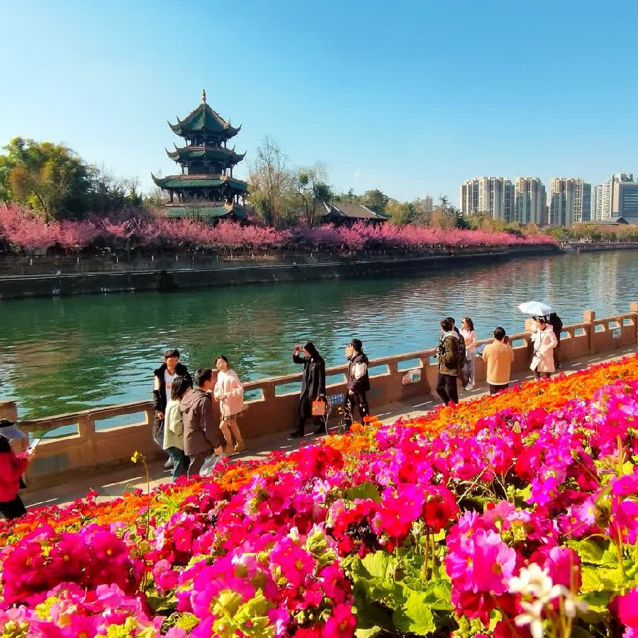 蜀葵花走出山谷,走下雪域,来到了城市。在成都市中心天府广场绿地里栽植的蜀葵与大家见面了。市花芙蓉和川花蜀葵同城开放,丰富