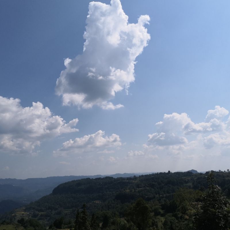 远瞧云彩浮山间,近看农家欢乐居。白色墙砖金碧瓦,排排楼屋整齐衙。花园新颖造行妙,秋菊桐蒿瓜果蔬。何物池中推浪迹,戏嬉青草